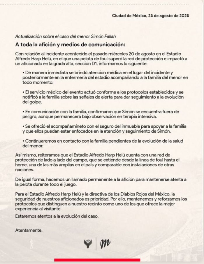 El club Diablos Rojos del México emitió un comunicado oficial en el que informó que se brindó atención médica inmediata en el lugar del incidente y posteriormente en la enfermería del estadio.