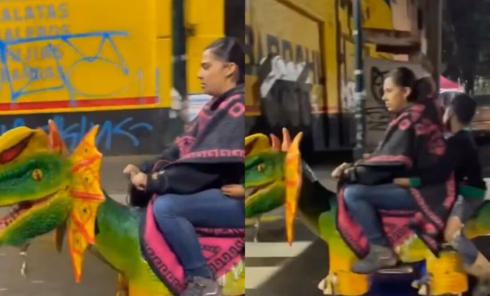 El video fue compartido en la red social X, donde rápidamente comenzó a circular. En la grabación, que tiene apenas algunos segundos de duración, se observa a la mujer, de aproximadamente 40 años, conduciendo el dinosaurio por una vialidad de la Ciudad de México, acompañada de un menor de edad.