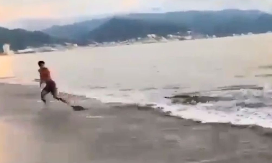 Según se observa en las imágenes, el joven se encontraba a punto de ingresar al mar cuando un cocodrilo emergió a pocos metros de distancia. El reptil avanzó en dirección al muchacho, quien logró salir rápidamente del agua y ponerse a salvo, sin que resultara con lesiones.
