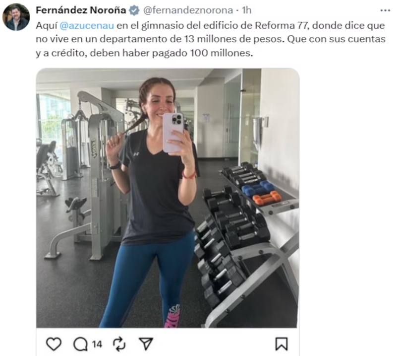 El choque escaló cuando Fernández Noroña publicó en X —antes Twitter— una imagen de Uresti en un gimnasio, que él identificó como parte de las amenidades del edificio Reforma 77. “Aquí @azucenau en el gimnasio del edificio de Reforma 77, donde dice que no vive en un departamento de 13 millones de pesos”, escribió.