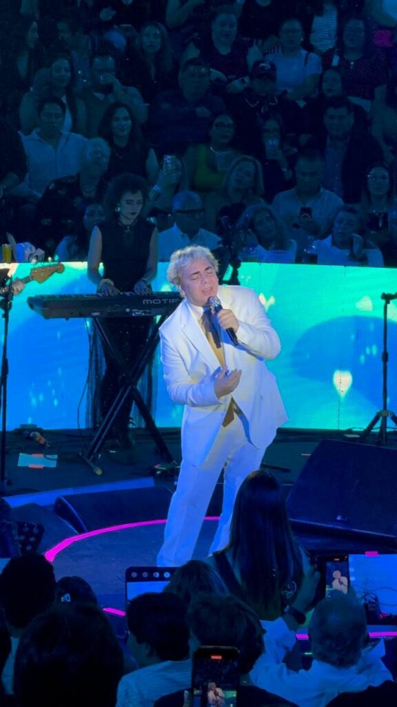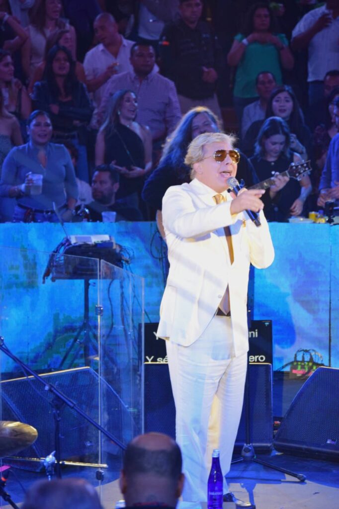 Vestido con un traje blanco impecable, el intérprete apareció en el escenario en medio de aplausos. Desde el primer instante, se entregó con su característico carisma, recordando por qué ha sido uno de los artistas más importantes de la balada romántica en Latinoamérica durante más de tres décadas.