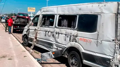 A la altura de la empresa Tabicel, el conductor del auto perdió el control del volante para así impactarse contra la contención de concreto que divide los carriles, luego continuó con su trayectoria errática y chocó también contra una camioneta de transporte de personal que por ahí circulaba, una Nissan Crafter de color blanco de la empresa Tour Fix. Por el golpe recibido, la camioneta se salió del asfalto y finalmente se volcó sobre un costado, afortunadamente iba vacía y nadie resultó lesionado.
