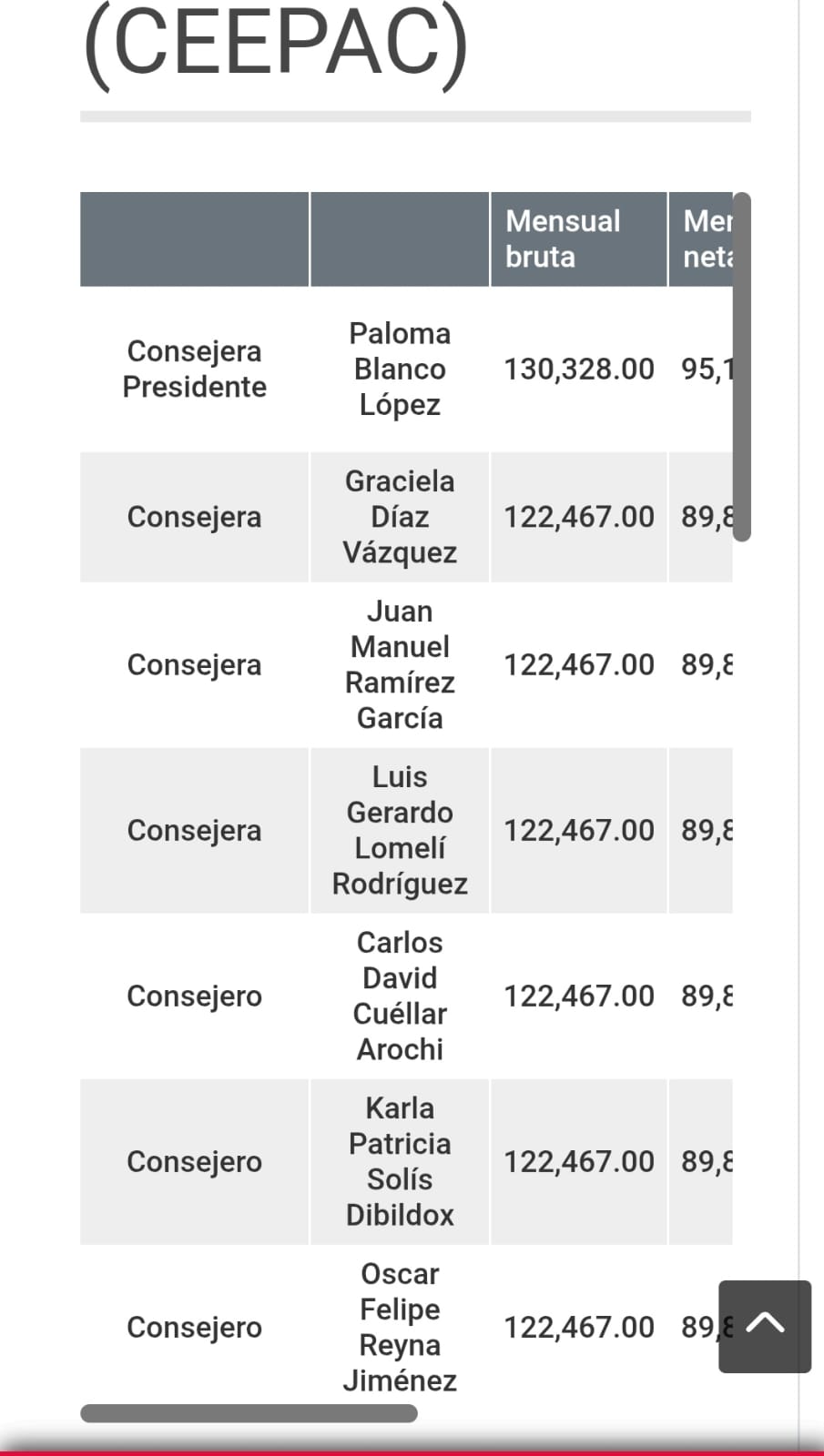 Una investigación del portal de noticias sinembargo.mx con base en el portal de transparencia del Ceepac, revela que al primer trimestre de este año la consejera presidenta, Paloma Blanco López reporta un sueldo neto de 130 mil 328 pesos y bruto mensual de 95 mil 125 pesos netos mensuales; las consejeras electorales Graciela Díaz Vázquez, Viviana Margarita Hernandez Carrera y Karla Patricia Solís Dibildox, así como los consejeros electorales Juan Manuel Ramírez García, Luis Gerardo Lomelí Rodríguez, Carlos David Cuéllar Arochi y Oscar Felipe Reyna Jiménez, gana 89 mil 803 pesos mensuales netos, aunque sin descuentos su sueldo es de 122 mil 467 pesos.