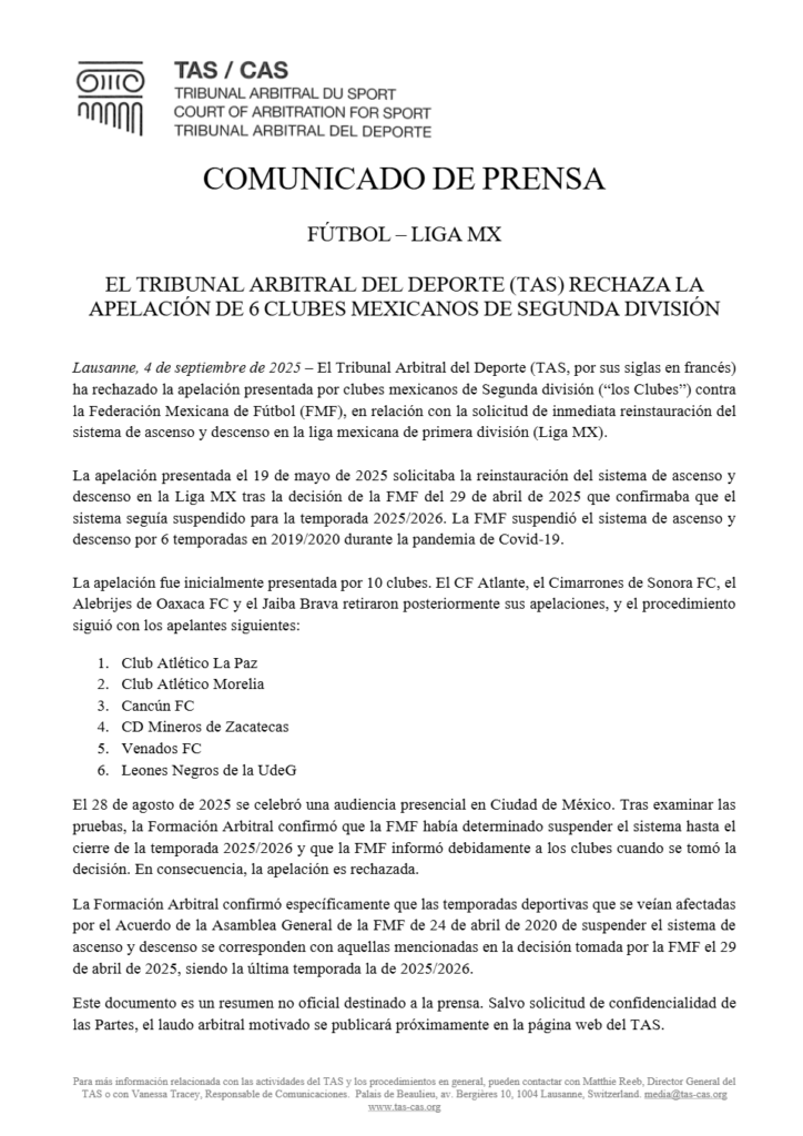 En un comunicado este jueves 4 de septiembre de 2025, el TAS rechazó la apelación presentada por dichos clubes, pero a la vez confirmó el regreso del ascenso y descenso en el futbol mexicano a partir de la temporada 2026-2027.