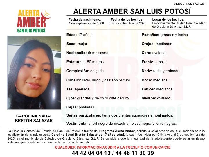 La Fiscalía General del Estado de San Luis Potosí (FGESLP) activa una Alerta Amber para la localización de Carolina Sadai Bretón Salazar, adolescente vista por última vez el tres de septiembre de 2025, en el fraccionamiento Ciudad Real, del municipio de Soledad de Graciano Sánchez.