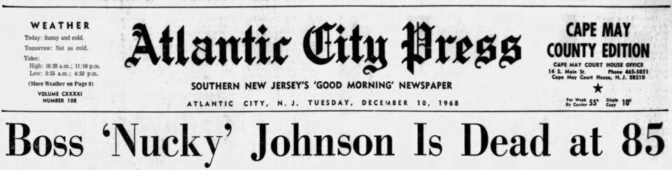 El periódico Atlantic City Press del Martes 10 de Diciembre de 1968, reportó a ocho columnas en su primera plana lo que sigue: “Boss ‘Nucky’ Johnson Is Dead at 85”. La nota viene acompañada, también en primera, de una fotografía de Nucky real en 1967, ya muy viejo, pero aún elegantemente vestido con un clavel en la solapa –como en los días de su gloria mafiosa. (Usé la página de Newspapers.com, ve la Liga 1.)