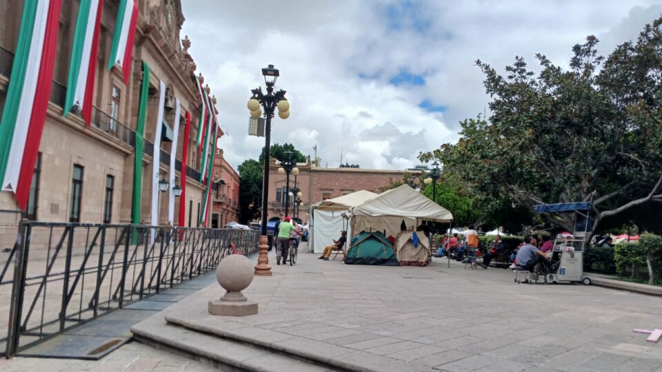A seis días del Grito de Independía, el frente a Palacio de Gobierno se encuentra invadido por casas de campaña donde pernoctan los quejosos y toldos donde realizan sus reuniones y hasta donde comen.