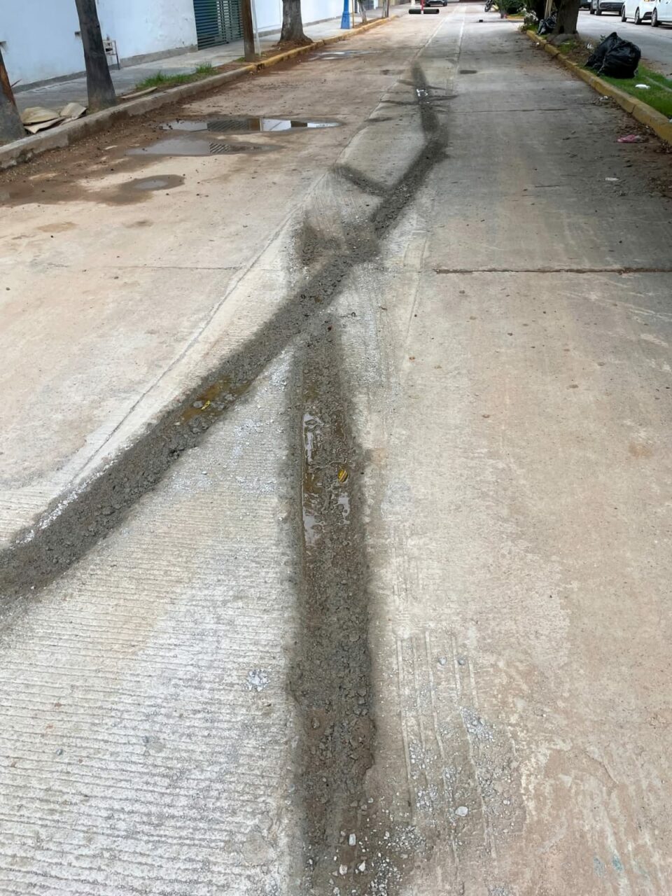 La obra de rehabilitación en la calle Miguel de Cervantes Saavedra sufrió afectaciones luego de que varios vehículos ingresaran a la zona cuando el concreto aún estaba fresco.
