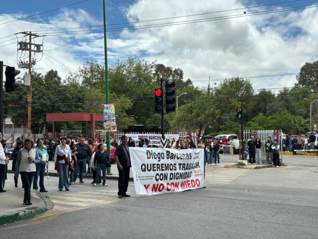 Trabajadores del Instituto Tecnológico de San Luis Potosí (ITSLP), se manifestaron dentro y fuera de las instalaciones de la institución, bloquearon la carretera a Rioverde, para exigir la destitución del director, José Diego Bárcenas Torres, a quien acusan de múltiples irregularidades administrativas y laborales,