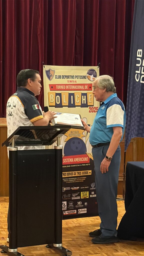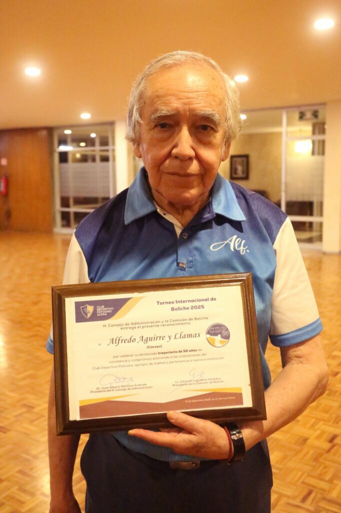 El H. Consejo de Administración del Club Deportivo Potosino (CDP) y la Comisión de Boliche rindieron un merecido reconocimiento a Alfredo Aguirre y Llamas, originario de la Ciudad de México, por su destacada trayectoria de 50 años de constancia y compromiso dentro de las instalaciones del club.