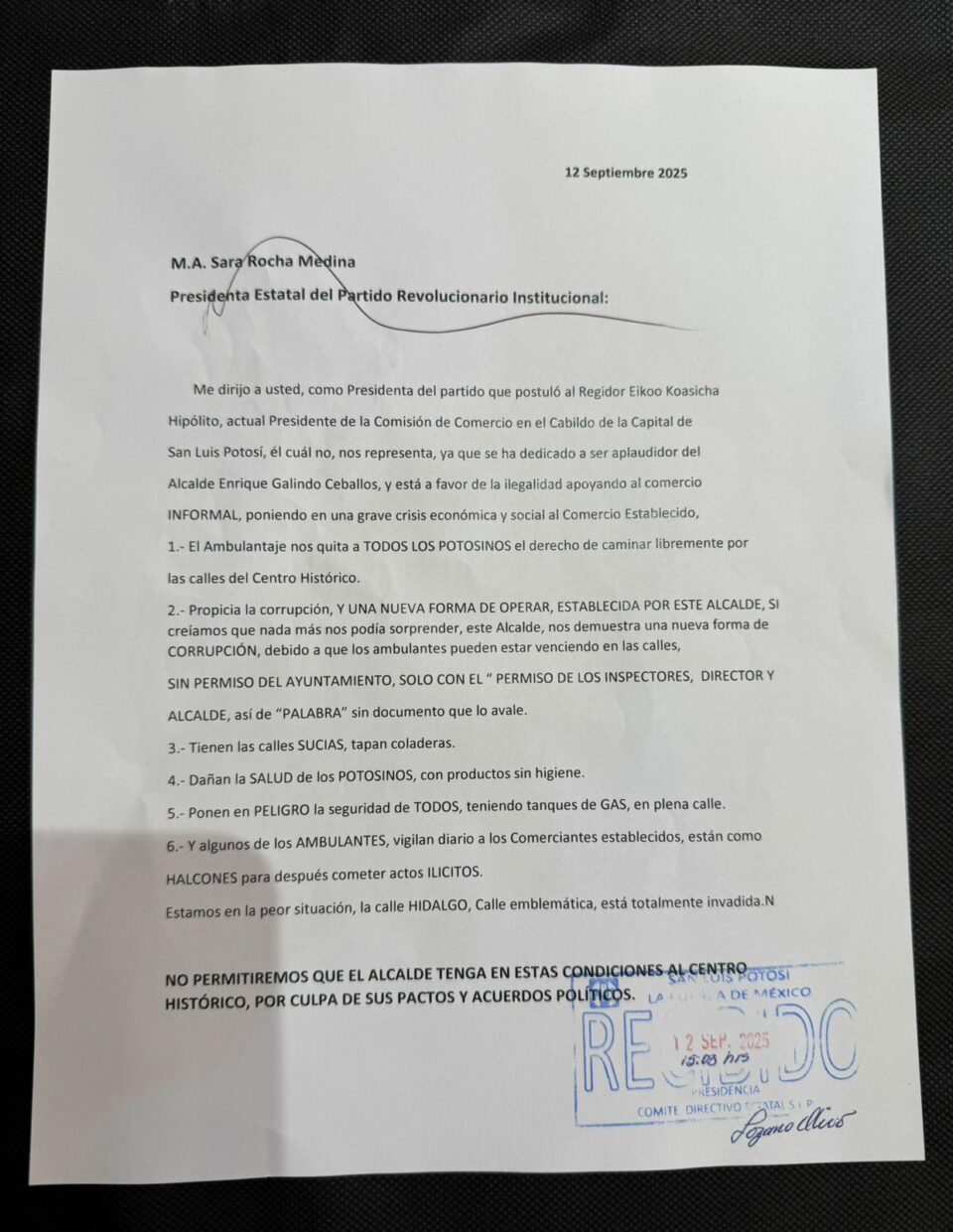 Cabe señalar que, la empresaria Alejandrina Cedillo Campos envió un escrito a la presidenta estatal del PRI, para que le solicite a su regidor acciones reales en contra del ambulantaje y llame a cuentas a los regidores de su partido Koasicha Hipólito, Margarita Hernández Fiscal y Julieta Abud Sarquís, luego de que denunciaron que el Centro Histórico está invadido por al menos 2 mil 300 ambulantes tolerados por las autoridades.