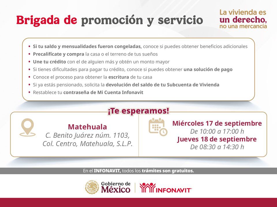 El INFONAVIT realizará su Brigada de Promoción y Servicio en Matehuala, San Luis Potosí, con el objetivo de acercar sus diferentes productos de financiamiento a las y los derechohabientes.