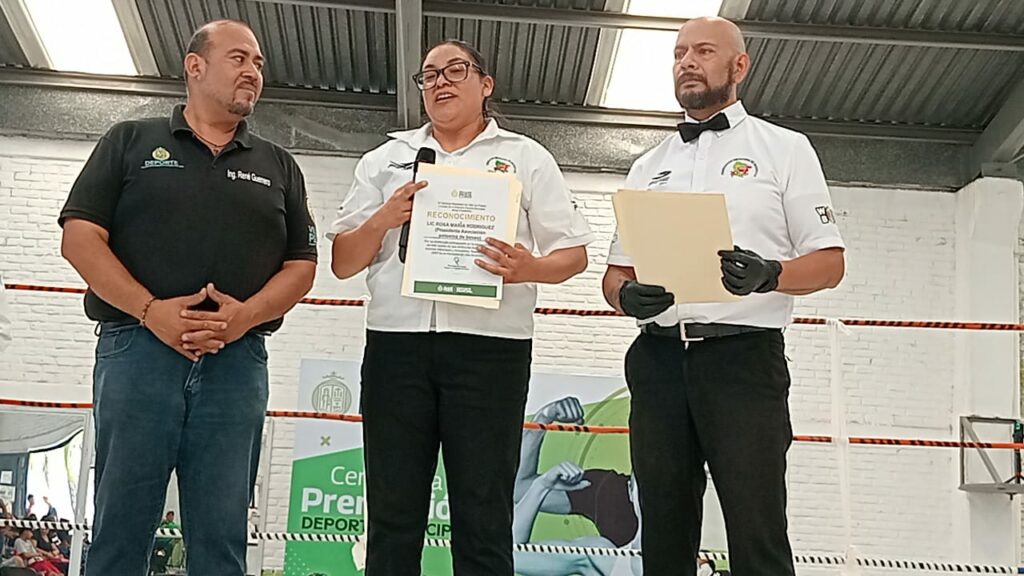 El Director de Deporte del ayuntamiento de Pozos René Guerrero hizo entrega del reconocimiento a la Presidenta de la Asociación de Boxeo Rosa María Rodríguez García así como al Delegación de dicha Asociación en el municipio Gerardo Surisday Montenegro Pérez; a ambos y su consejo directivo por el impulso al deporte en beneficio de la niñez y juventud de San Luis Potosí.