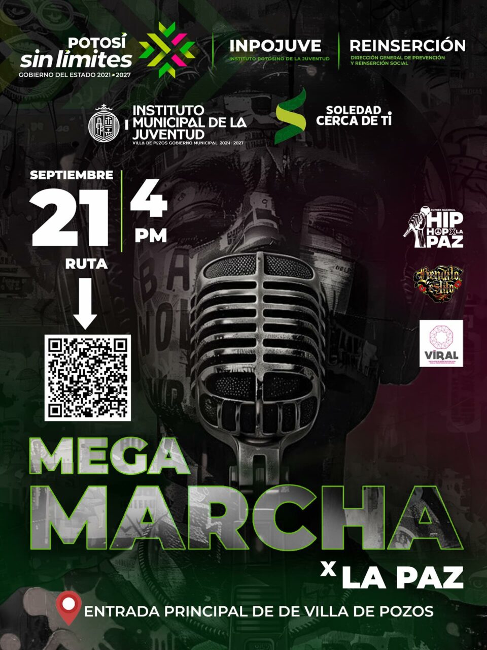 La marcha forma parte del programa Hip Hop por la Paz que está coordinado con la Dirección General de Prevención y Reinserción Social, los municipios de Soledad de Graciano Sánchez y Villa de Pozos, así como Red VIRAL y el colectivo Bendito Estilo. El recorrido iniciará en la entrada principal de Villa de Pozos, sobre la carretera 57, rumbo al Jardín Principal.
