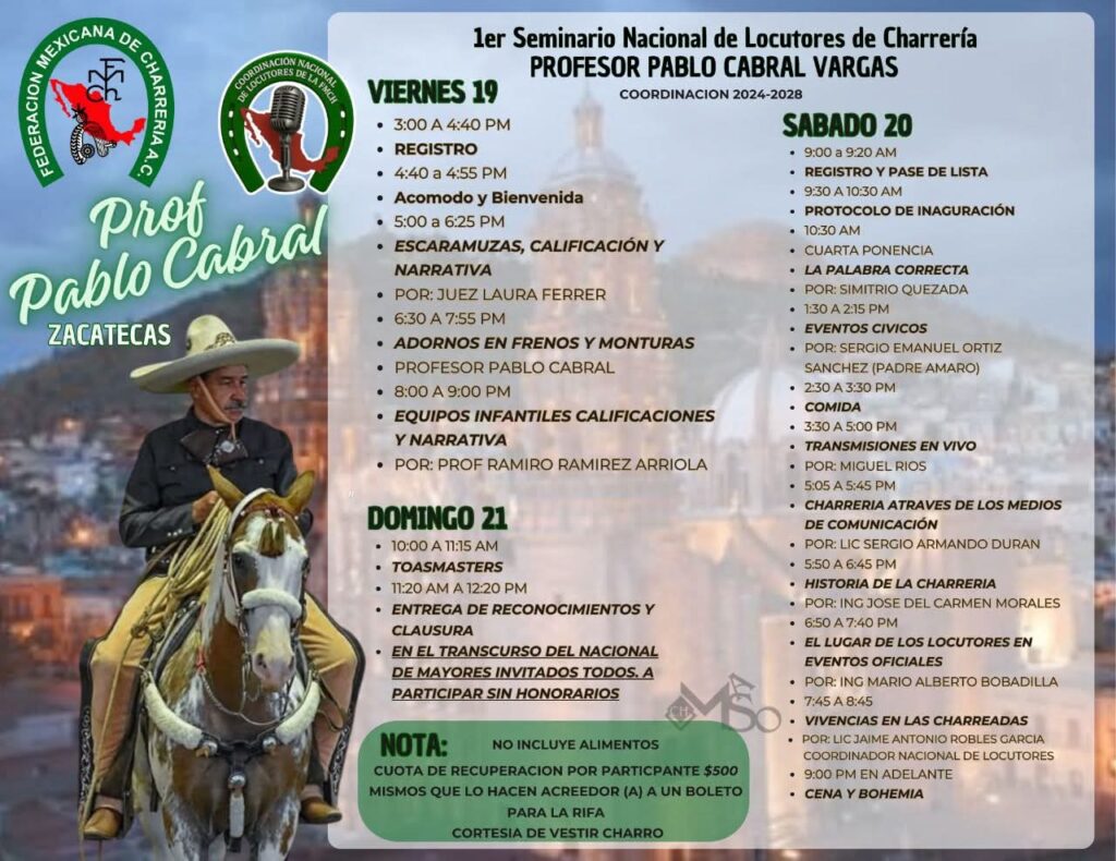 Del viernes 19 al domingo 21 de septiembre se llevará a cabo el Seminario Nacional de Locutores Charros cuya sede será la ciudad de Zacatecas y organizado por la Coordinación Nacional de Locutores de la Federación Mexicana de Charrería que encabeza Jaime Antonio Robles García.