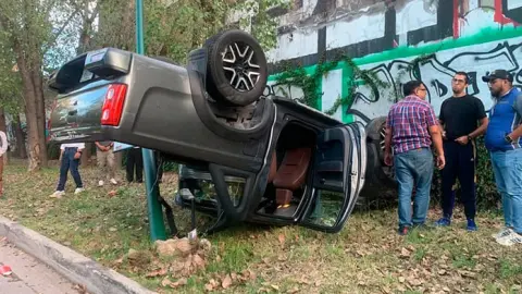Una camioneta que circulaba a exceso de velocidad por el río Santiago terminó volcada tras chocar contra un poste de alumbrado público. El vehículo quedó con las llantas hacia arriba, sin que se reportaran personas lesionadas.
