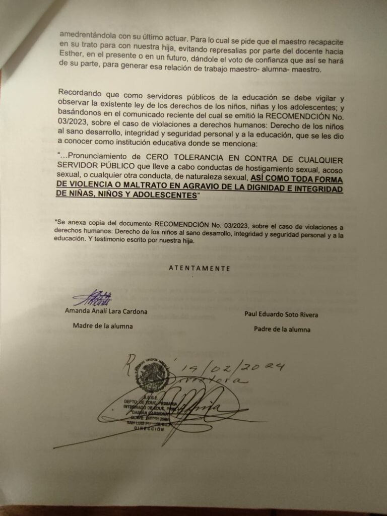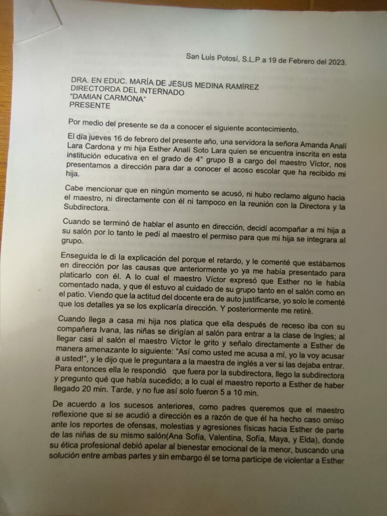 Recordó que el maestro acusado ya había sido denunciado por agresión física en el año de 2023 por otra madre de familia. “La otra mamá dice que se une a nuestra denuncia porque a ella tampoco le hicieron caso el año pasado”.