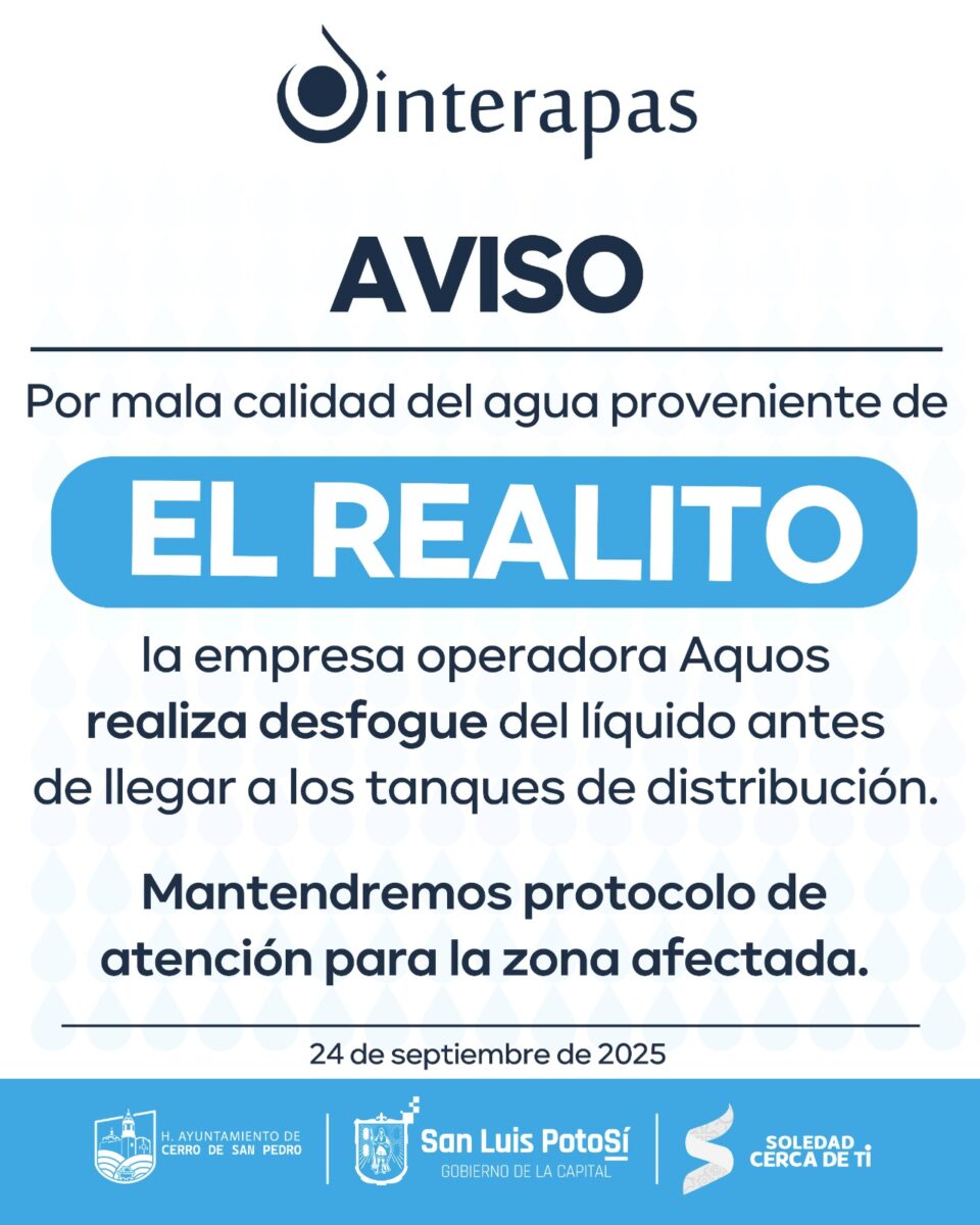 SLP.- Ante la detección de agua que no cumplía con los parámetros de la norma oficial para consumo humano, la empresa Aquos, responsable de operar el sistema “El Realito” informó que suspenderá temporalmente el envío de agua para llevar a cabo una limpieza en la red.