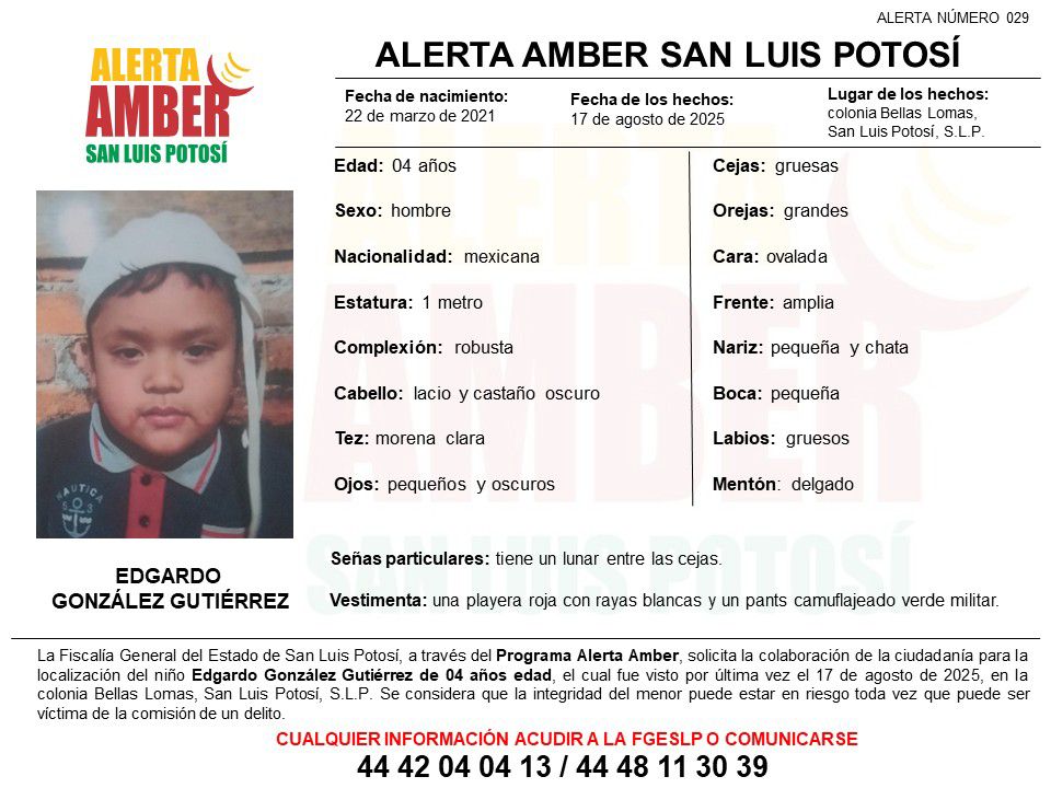 La Fiscalía General del Estado de San Luis Potosí (FGESLP) activó una ficha de Alerta Amber para la localización de Edgardo González Gutiérrez, quien fue visto por última vez el 17 de agosto de 2025, en la colonia Bellas Lomas de la ciudad capital.