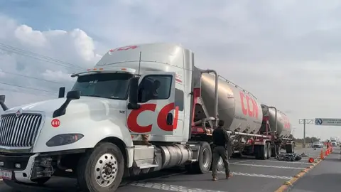 El accidente ocurrió alrededor de las 15:30 horas de este jueves, a unos 800 metros de la intersección con la carretera a México. La pareja viajaba a bordo de una motocicleta azul cuando el conductor intentó rebasar a un tráiler de doble remolque con tolvas acopladas.