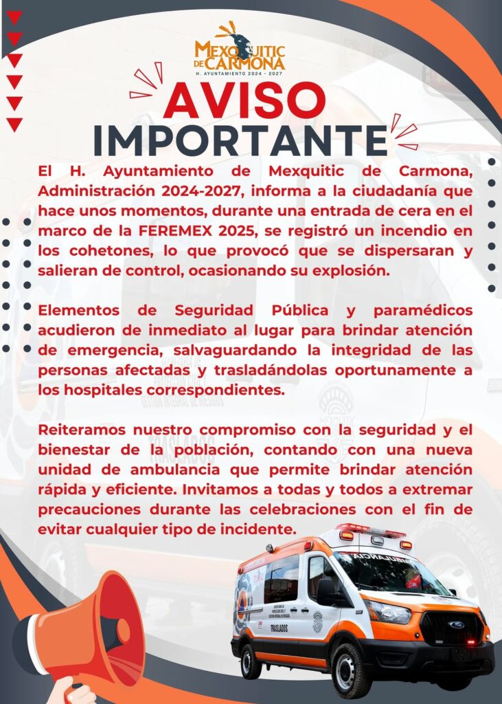 Aunque el Ayuntamiento de Mexquitic de Carmona, Administración 2024-2027, informó que elementos de Seguridad Pública y paramédicos atendieron con rapidez a las personas afectadas, el incidente ha puesto en evidencia las fallas en la supervisión y medidas preventivas de Protección Civil.