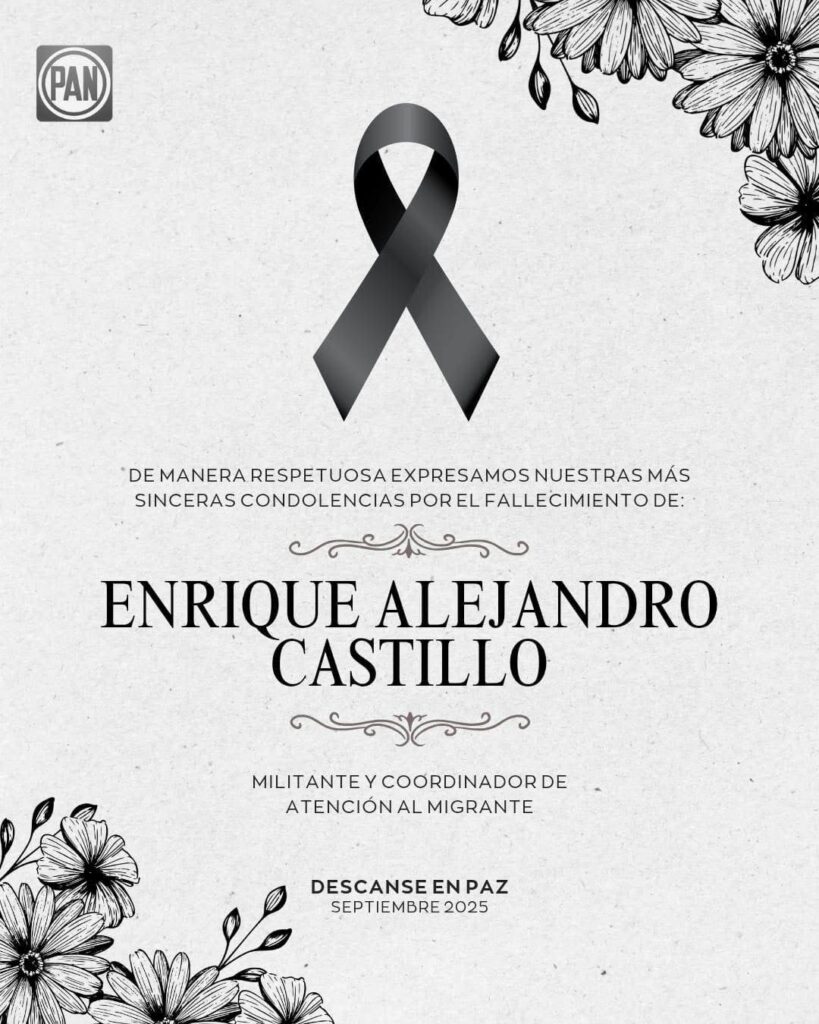 A través de un comunicado el Comité Directivo Estatal del PAN confirmó y expresó sus condolencias por la muerte de Enrique Alejandro Castillo, Secretario de Atención al Migrante del blanquiazul, quien también laboraba en la dirección de Educación del ayuntamiento capitalino.