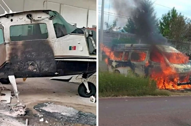 Morelia, Mich., Presuntos miembros del cártel Jalisco Nueva Generación balearon e incendiaron con drones explosivos tres avionetas tipo Cessna, que se encontraban en la pista de aterrizaje de un hangar del municipio de Tepalcatepec, y en un hecho casi simultáneo, en un enfrentamiento en Coahuayana, mataron a dos guardias comunitarios del grupo que encabeza Héctor Zepeda, El Teto.