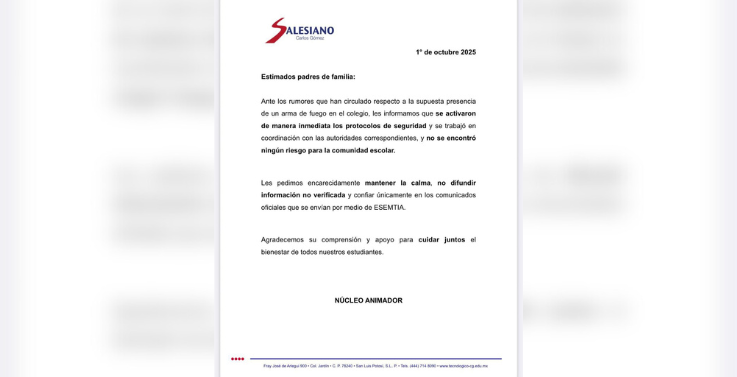A través de un comunicado la institución hizo un llamado a la calma y exhortó a la comunidad escolar a no difundir información no verificada que pueda generar desinformación o alarma innecesaria.