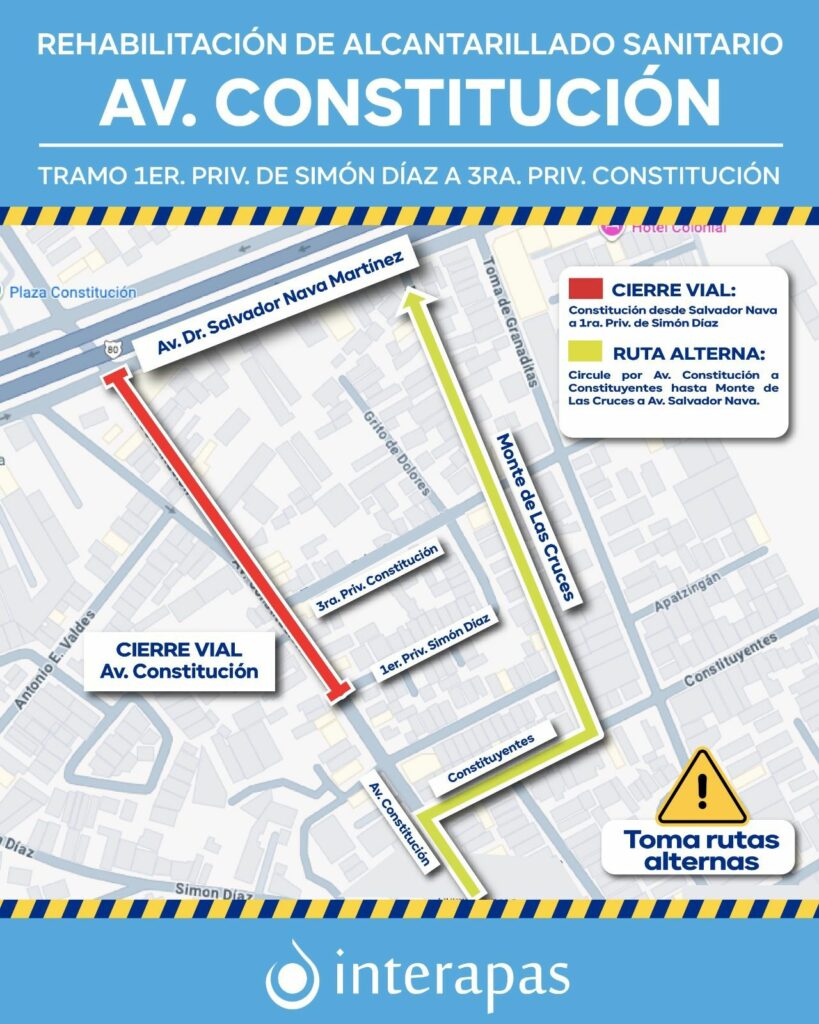 Como parte de la rehabilitación sanitaria que Interapas realiza en la avenida Constitución, a la altura de la Tercera Privada de Constitución y la Primera Privada de Simón Díaz, en la colonia Santa Fe, se determinó ampliar el cierre vial para garantizar la seguridad de los transeúntes y vecinos de la zona.