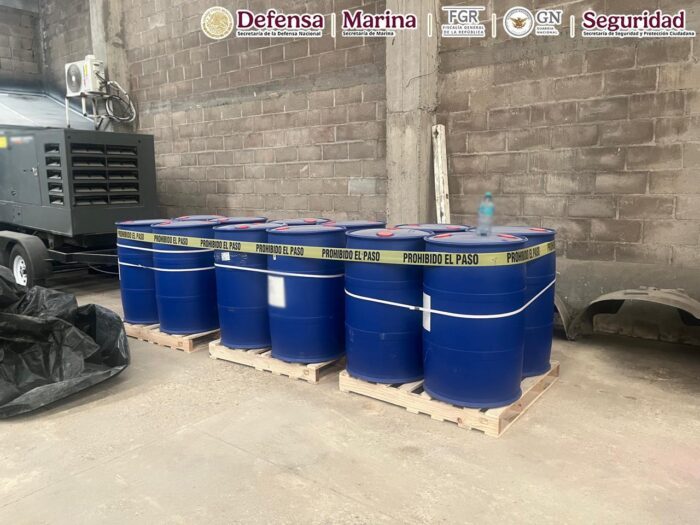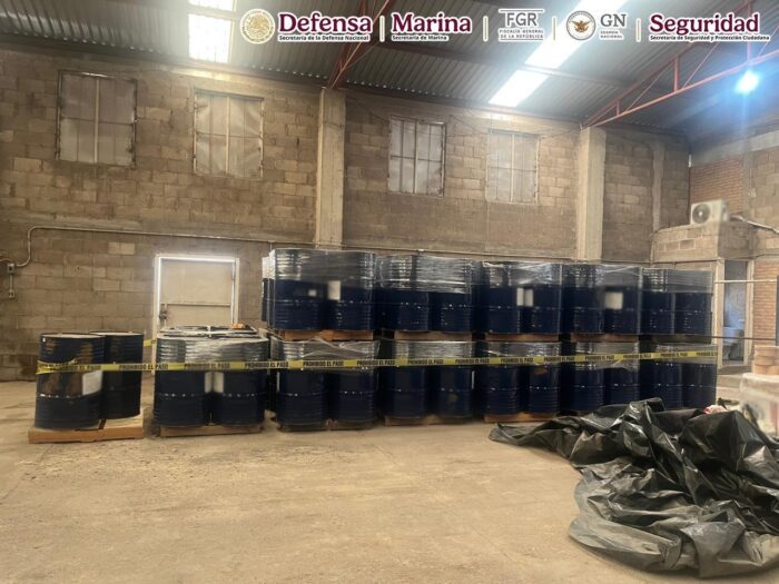 Durante el operativo fueron asegurados cerca de 200 tambos con solvente, ácido clorhídrico y thinner, más de 2,000 costales con sustancia granulada, diez costales gigantes con precursor químico, 95 bidones con cloro, amoniaco y formol, 25 paquetes con marihuana, así como una pipa con alrededor de 7,000 litros de hidrocarburo de “aparente procedencia ilícita”.