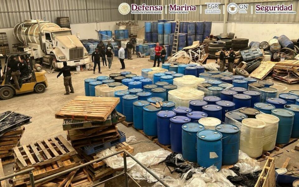 Durante el operativo fueron asegurados cerca de 200 tambos con solvente, ácido clorhídrico y thinner, más de 2,000 costales con sustancia granulada, diez costales gigantes con precursor químico, 95 bidones con cloro, amoniaco y formol, 25 paquetes con marihuana, así como una pipa con alrededor de 7,000 litros de hidrocarburo de “aparente procedencia ilícita”.