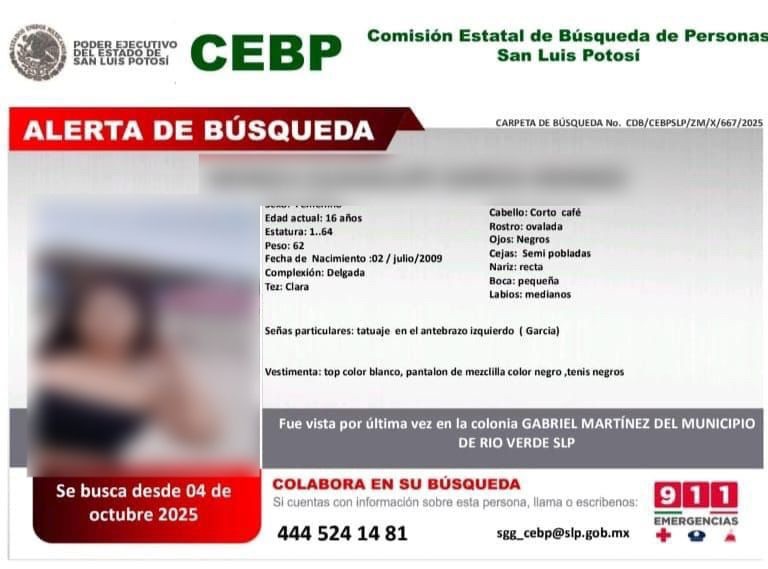 -Contaba con ficha de búsqueda del pasado 04 de octubre, tras ser vista por última vez, en la colonia Gabriel Martínez, perteneciente al municipio de Rioverde.