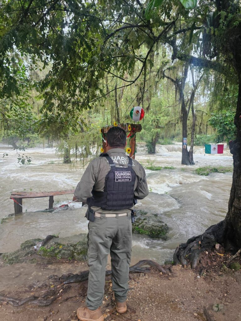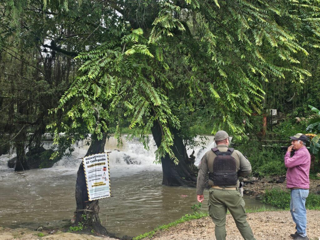 La Jefatura Regional de la Guardia Civil Estatal en la Huasteca con elementos de la Base Operativa Tamasopo realizan recorridos de seguridad y vigilancia en la cabecera municipal, así como en las comunidades de El Trampolín, Tambaca, Damián Carmona, El Chino y Rascón, con el propósito de monitorear el nivel del río y prevenir posibles riesgos de inundación o deslaves ocasionados por las lluvias recientes.