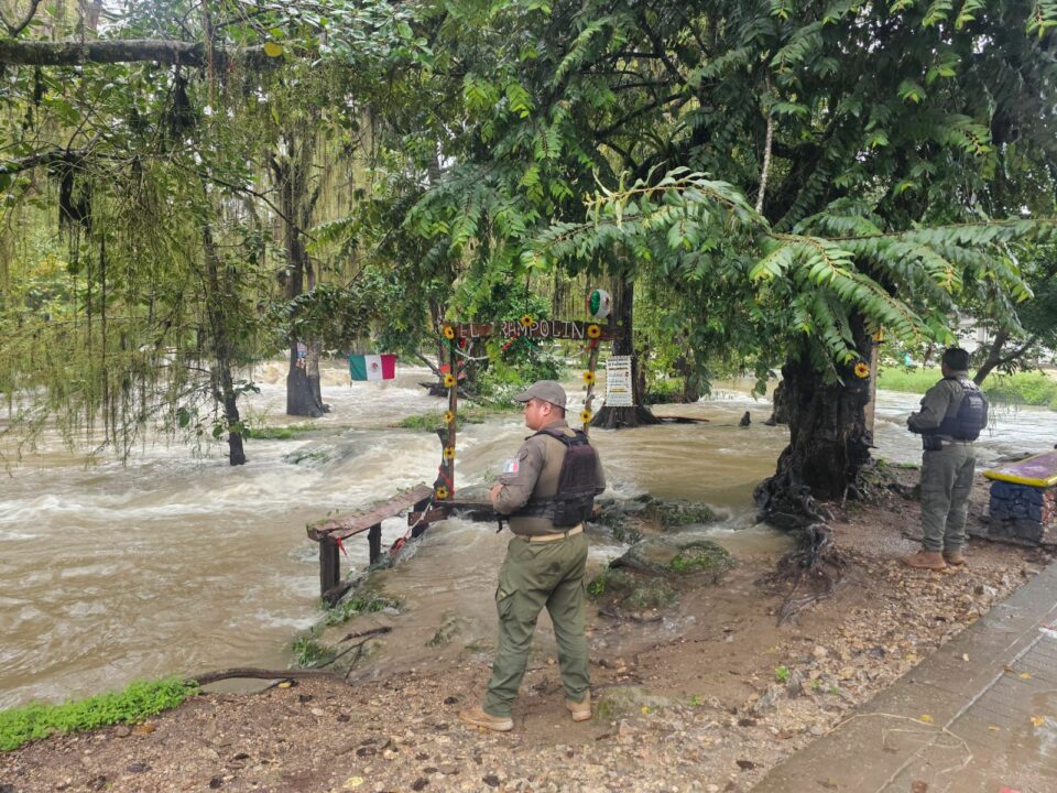 La Jefatura Regional de la Guardia Civil Estatal en la Huasteca con elementos de la Base Operativa Tamasopo realizan recorridos de seguridad y vigilancia en la cabecera municipal, así como en las comunidades de El Trampolín, Tambaca, Damián Carmona, El Chino y Rascón, con el propósito de monitorear el nivel del río y prevenir posibles riesgos de inundación o deslaves ocasionados por las lluvias recientes.