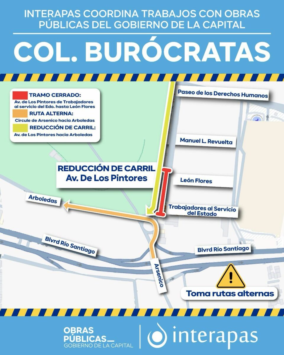 Por ello, se mantiene cierre parcial en la avenida De los Pintores y cierres totales en las calles León Flores, Luis Magallanes, Antonio Aguilar y Trabajadores del Estado. Se recomienda a los usuarios atender las indicaciones viales de la Policía Vial de la SSPC y utilizar vías alternas.