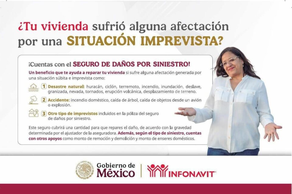 Además de las afectaciones causadas por lluvias e inundaciones, el Seguro de Daños protege el patrimonio de los trabajadores ante sismos, ciclones, huracanes, vientos tempestuosos, caída de árboles, granizo o nieve, incendio, erupción volcánica, explosión o desplazamiento súbito de terreno.