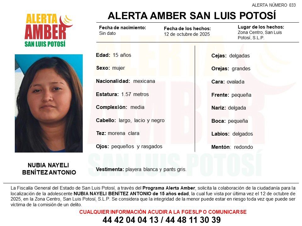 La Fiscalía General del Estado (FGE) activó una ficha de Alerta Amber para la localización de Nubia Nayeli Benítez Antonio, de 15 años de edad, quien fue vista por última vez el 12 de octubre de 2025 en la Zona Centro de la capital potosina.