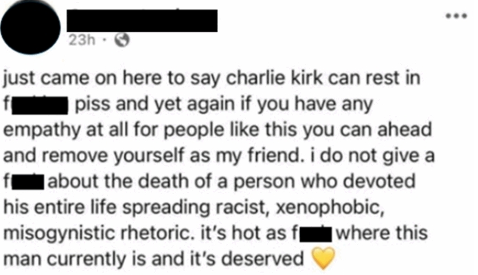 Entre los seis hay un argentino que apuntó que Kirk dedicó toda su vida a propagar una retórica racista, xenófoba y misógina y que merecía arder en el infierno. “Visa revocada”, anunció el Departamento de Estado en esa red social, que no identifica a la persona pero sí difunde el mensaje que esta colgó en X.