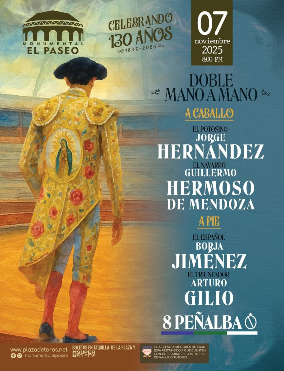 Dos artes en una noche de gala: el Arte de Marialva y el Arte de Cuchares con los rejoneadores Jorge Hernández de San Luis Potosí, el español Guillermo Hermoso de Mendoza y los matadores Borja Jiménez el mexicano Arturo Gilio.