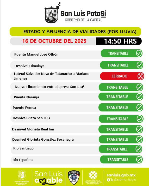 Con el nivel del agua en descenso y tras verificar las condiciones de seguridad, el paso vehicular fue restablecido en ambos sentidos, lo que permitirá normalizar la movilidad en la zona metropolitana de San Luis Potosí.