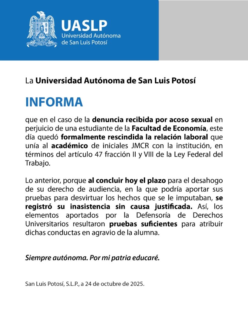 La Universidad Autónoma de San Luis Potosí (UASLP) informó que este viernes fue rescindida la relación laboral con el académico identificado con las iniciales J.M.C.R., tras acreditarse una denuncia por acoso sexual en perjuicio de una estudiante de la Facultad de Economía.