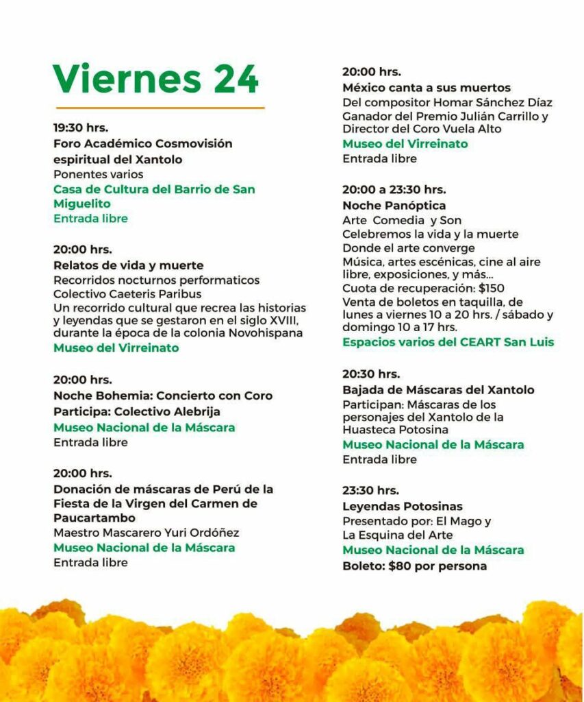 Entre las actividades destacadas se encuentran desfiles de comparsas tradicionales, muestras gastronómicas, exposiciones de arte huasteco, talleres, conciertos y presentaciones escénicas que harán vibrar a la ciudad con el espíritu del Xantolo.