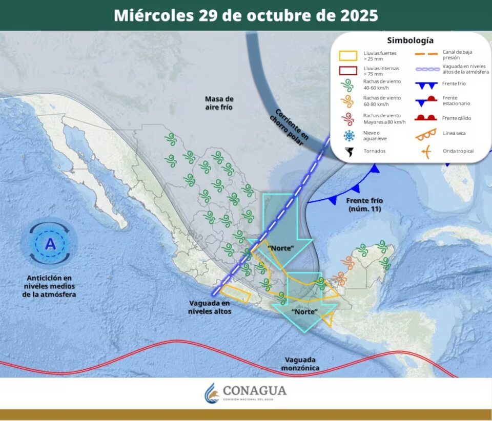 Diversos sistemas meteorológicos interactuarán sobre el territorio nacional, generando chubascos, rachas de viento intensas y marcados contrastes de temperatura, especialmente en el norte, noreste, oriente y sureste del país.