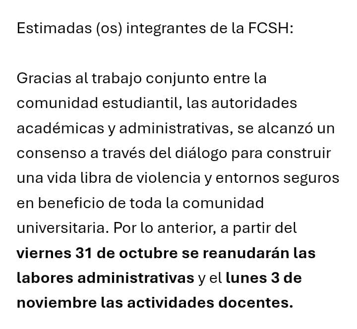 A través de mensajes en redes sociales, se dio a conocer que, los estudiantes de las facultades de Psicología, Ciencias de la Información, y, Ciencias Sociales y Humanidades lograron un acuerdo y este jueves entregarán el campus.