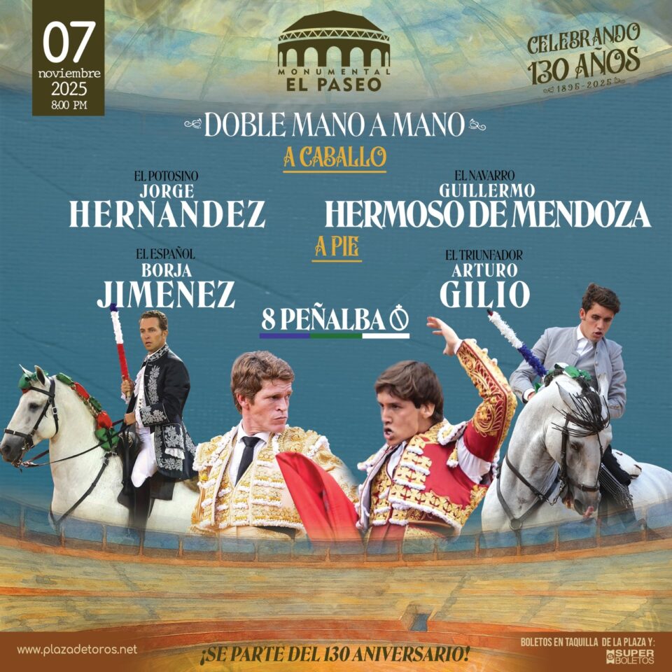 Los dos caballistas: Jorge Hernández de San Luis Potosí en mano a mano con Guillermo Hermoso de Mendoza y en el toreo a pie el duelo entre el sevillano Borja Jiménez y el mexicano Arturo Gilio.