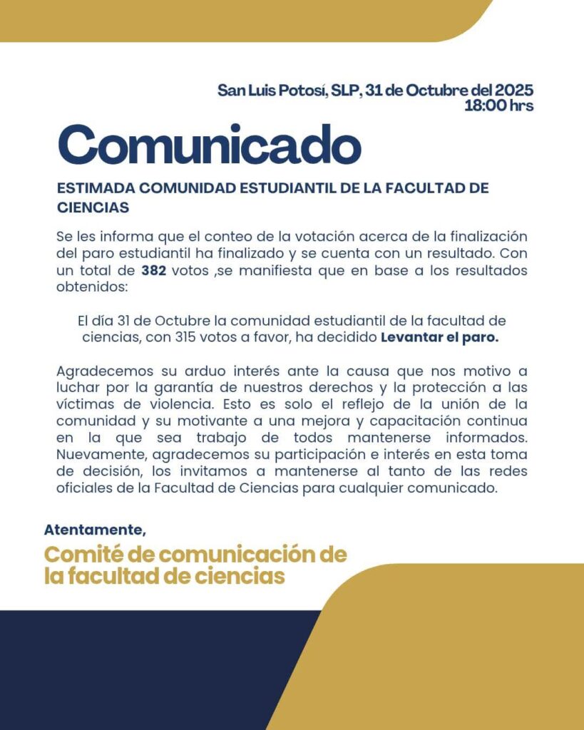 Luego de una votación realizada en asamblea estudiantil, los alumnos de la Facultad de Ciencias de la Universidad Autónoma de San Luis Potosí (UASLP) decidieron levantar el paro que mantenían desde el pasado 18 de octubre, en apoyo a las protestas surgidas tras la violación cometida contra una estudiante de la Facultad de Derecho.