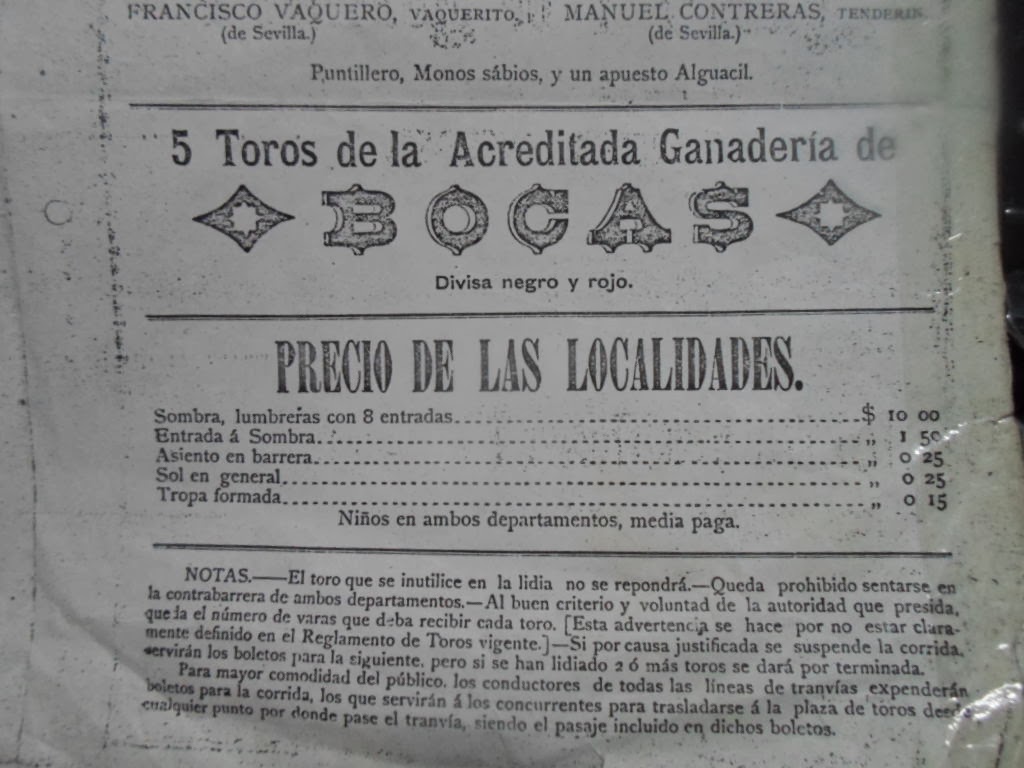 NOTAS: – El toro que se inutilice en la lidia no se repondrá. – Queda prohibido sentarse en la contrabarrera de ambos departamentos. – Al buen criterio y voluntad de la autoridad que presida, queda el número de varas que deba recibir cada toro. (Esta advertencia se hace por no estar claramente definido en el Reglamento de Toros vigente.)
