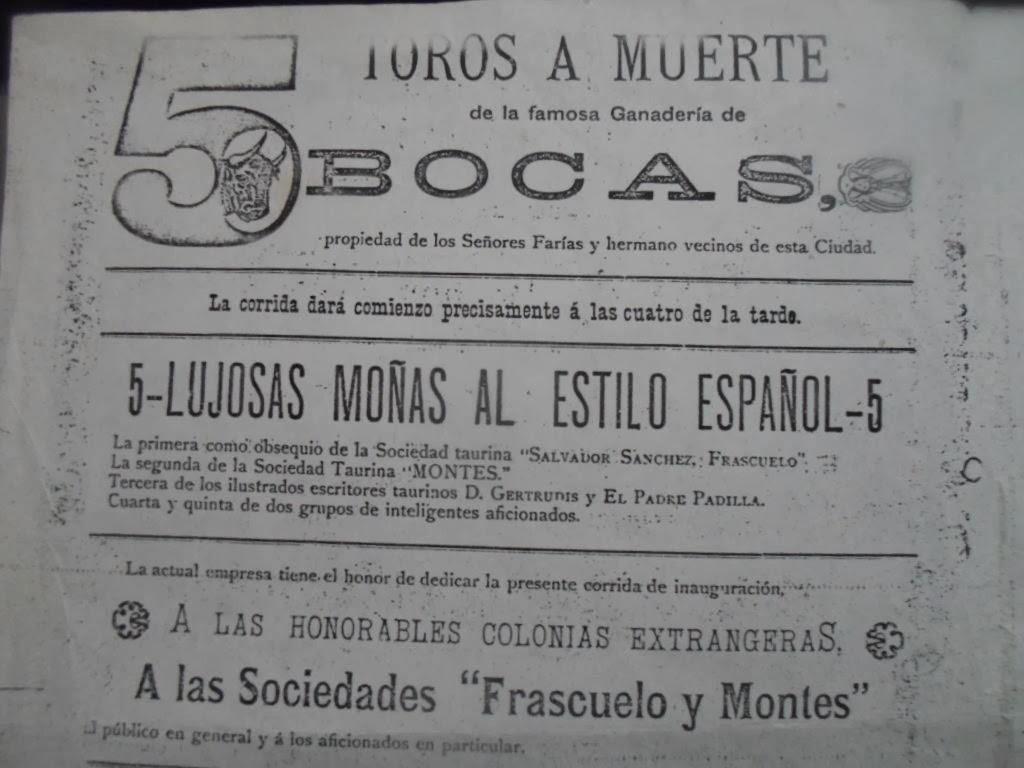 5 toros a muerte de la famosa ganadería de Bocas, propiedad de los señores Farías y hermano, vecinos de esta ciudad.