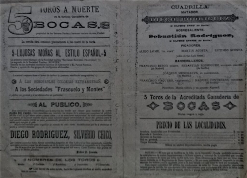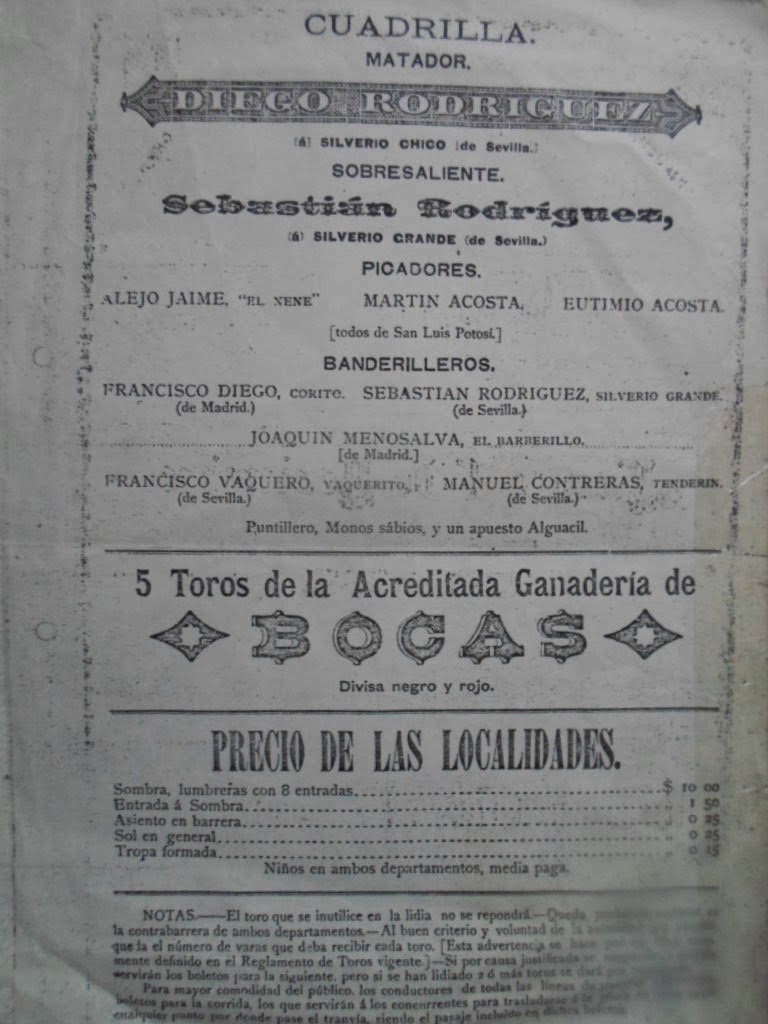 Bien conocidos son los sacrificios que la empresa ha tenido que vencer para construir la nueva PLAZA DEL PASEO y bien conocidos son también los deseos de la misma por complacer al público de San Luis, al que tanto quiere y tanto debe; y si en anteriores temporadas ha visto correspondidos sus afanes, en la actual ocasión espera como entonces seguir mereciendo el favor del público, para lo cual pondrá cuanto esté de su parte, presentando ganado en buenas condiciones y los diestros más notables que vengan al país.