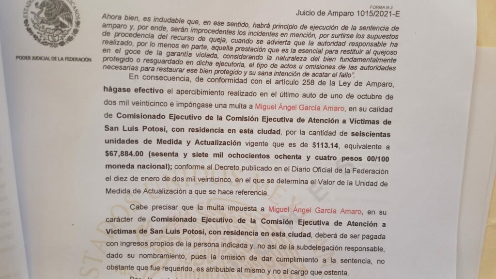 El nuevo subsecretario de Gobernación de San Luis Potos, Miguel Ángel García Amaro fue multado con 67 mil 884 pesos por el Juzgado Segundo de Distrito en San Luis Potosí, por incumplir una sentencia de amparo relacionada con la reparación integral del daño a la víctima María de Jesús “Marichuy” Almendarez Prieto.